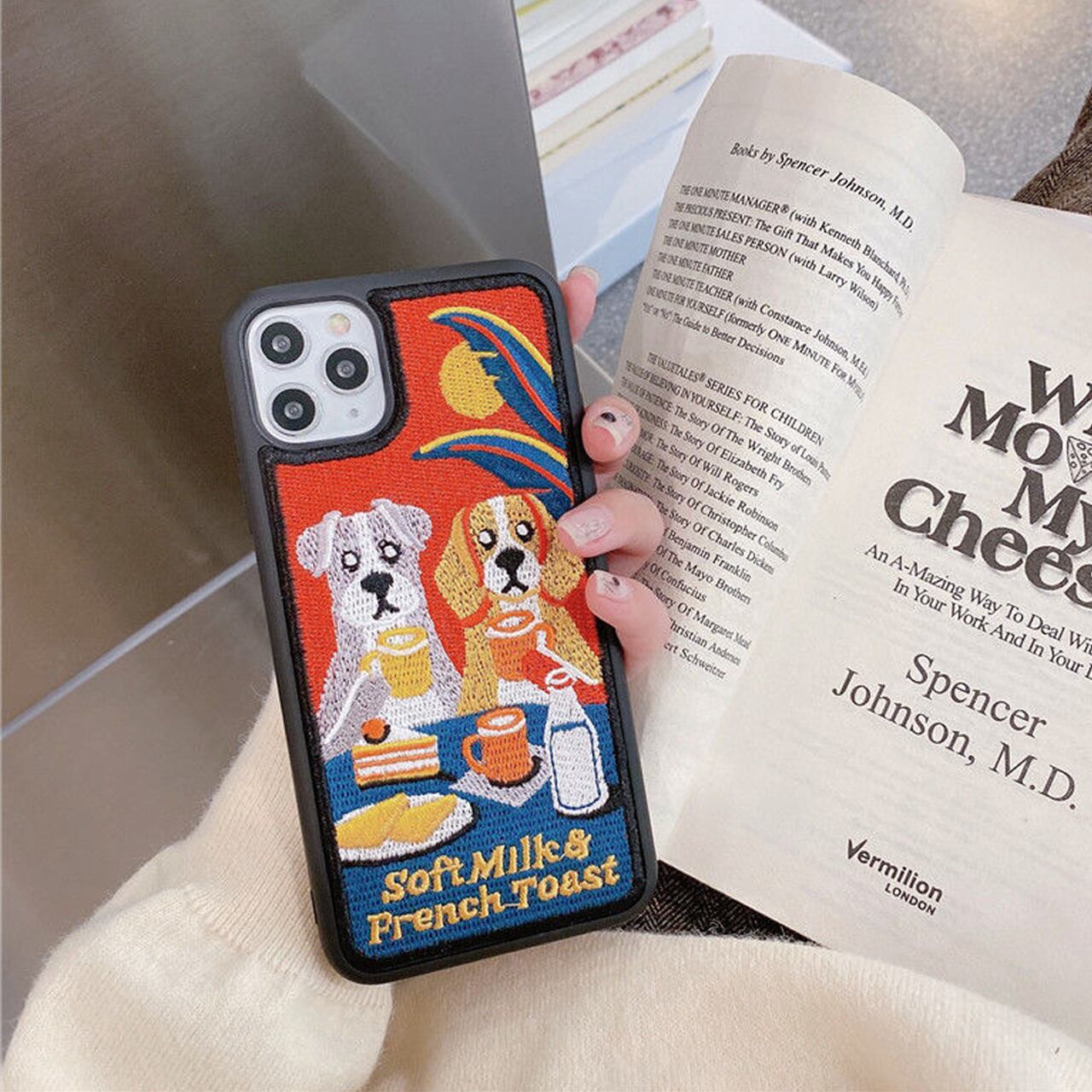 ケースの背面が全部刺繍~~!CAFEでくつろぎ時間のドッグたち♡可愛いε9(๑>ω<)6з