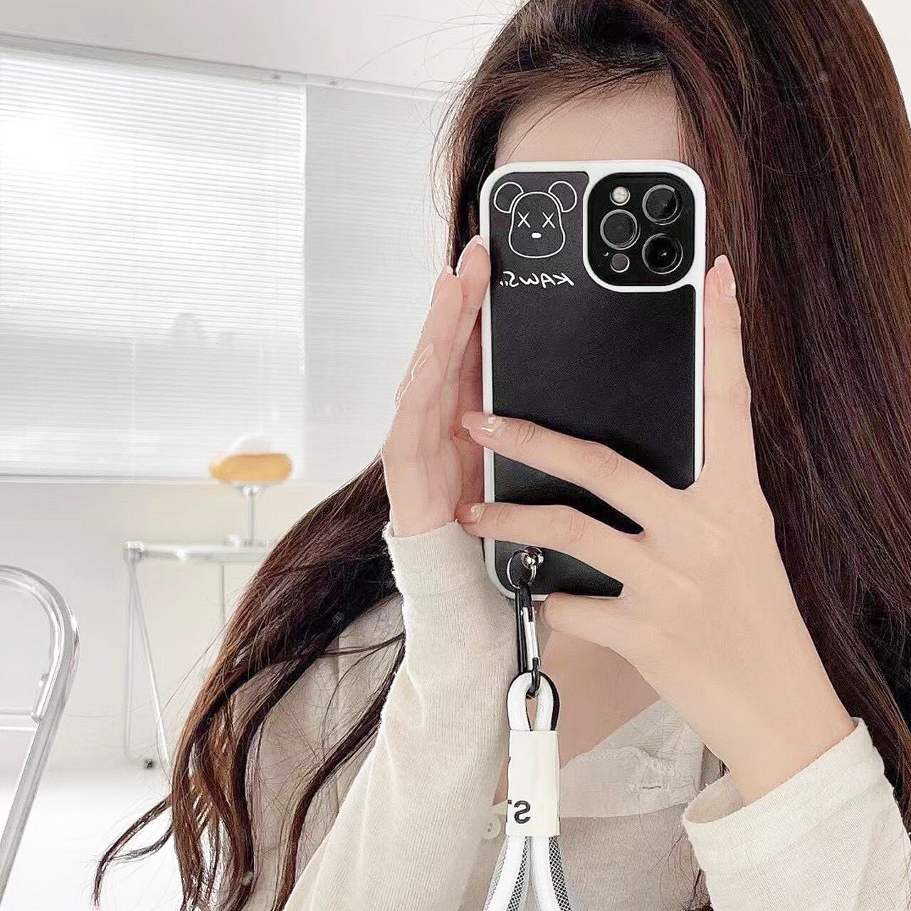 iPhoneケース☆彡 モノトーンBEARストラップ付